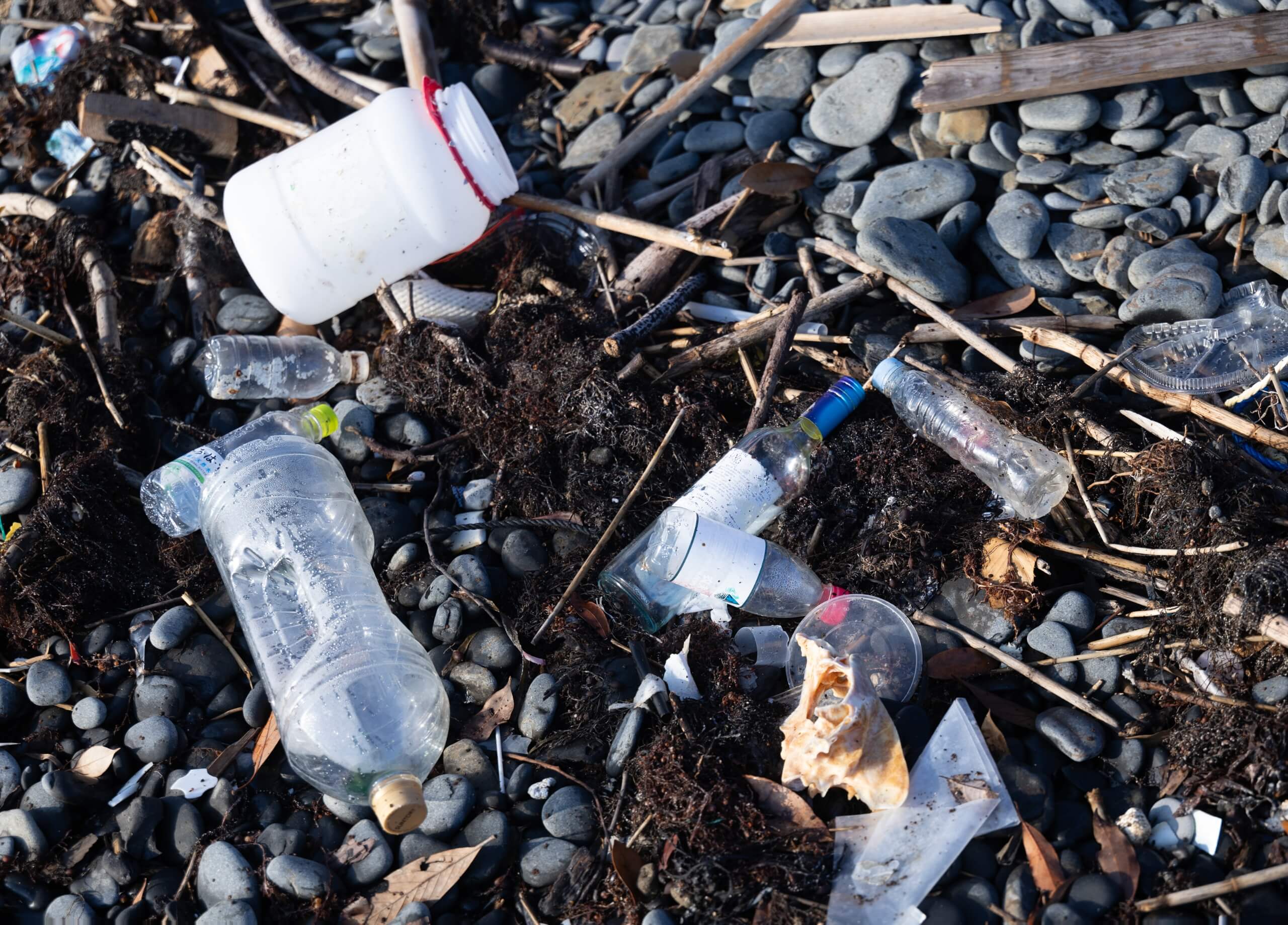 ゴミが漂着している。