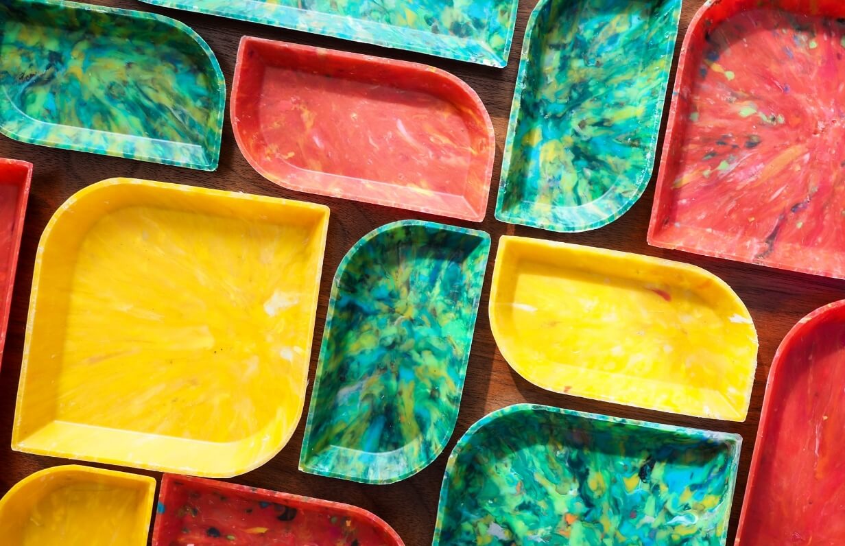 ボランティアや漁業者、企業と連携し、また学校の体験学習や拾い箱から海洋プラスチックを回収。民間企業の再生技術により、それぞれに合った方法でアップサイクルし新たな価値を創造します。